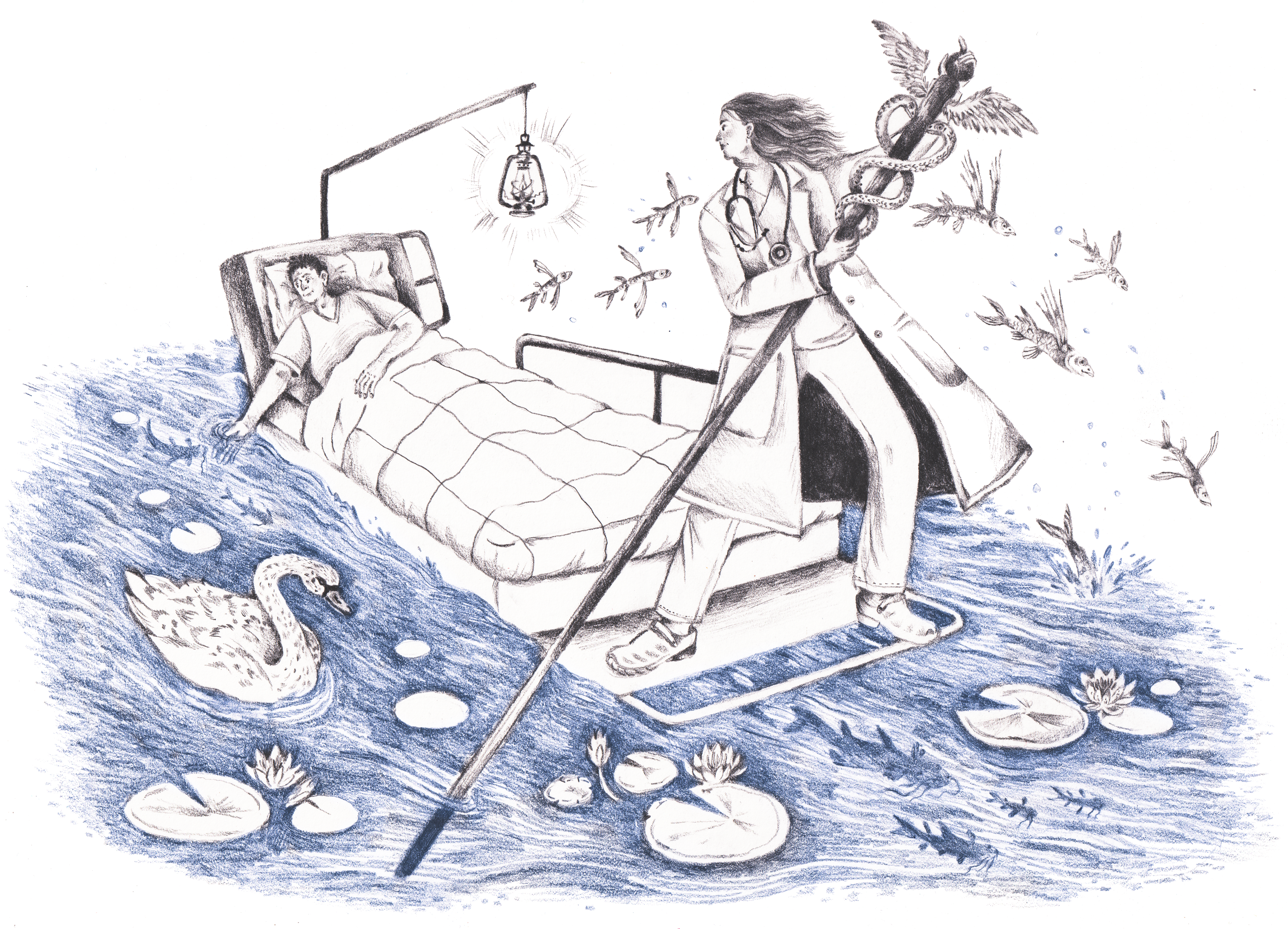 Illustrator Aida de Jong brengt het nieuws in beeld. Praten over de dood is moeilijk. We houden haar het liefst op afstand. En als ze toch in de buurt komt, springen artsen en verpleegkundigen op om haar te verjagen. Maar wat als dat niet gaat? Wanneer ga je over tot palliatieve zorg, oftewel een vreedzaam sterven? Om die vraag te beantwoorden, kunnen artsen en verpleegkundigen 'les in vreedzaam sterven' krijgen. Sander de Hosson, longarts in het Wilhelmina Ziekenhuis Assen, vertelt erover aan de Volkskrant, en haalt de vooroordelen over palliatieve zorg onderuit.