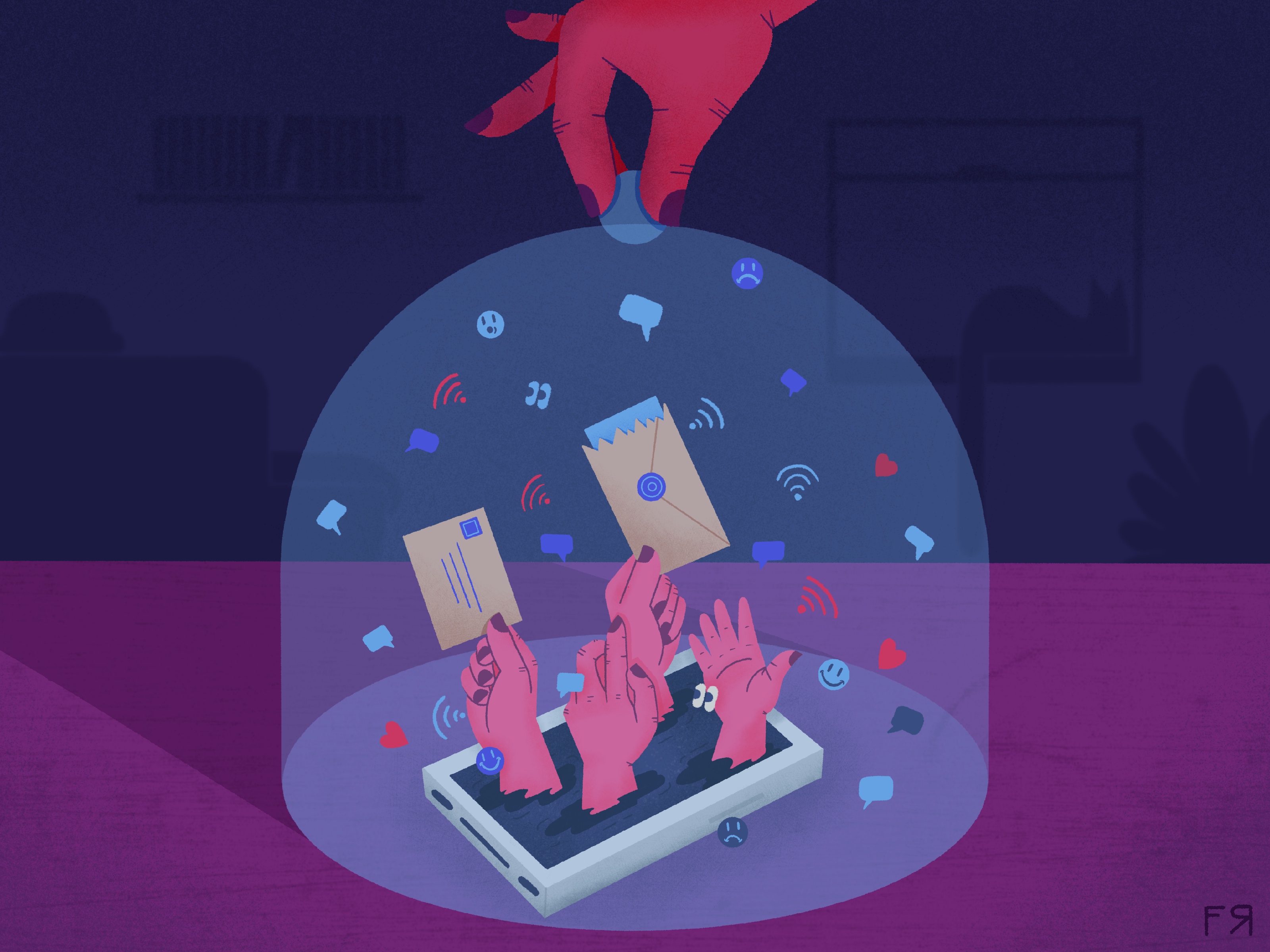 Illustrator Sebastian Eisenberg brengt het nieuws in beeld. In België, waar hij woont, overlegt de federale regering over het invoeren van een 'deconnectierecht'. Dat geeft werknemers het recht om buiten werktijd berichten van hun werkgever en collega's te negeren. Dat mag in principe nu al, maar als werknemer kun je momenteel toch negatieve gevolgen ervaren als je je baas negeert. Het deconnectierecht geeft je als het ware rugdekking.